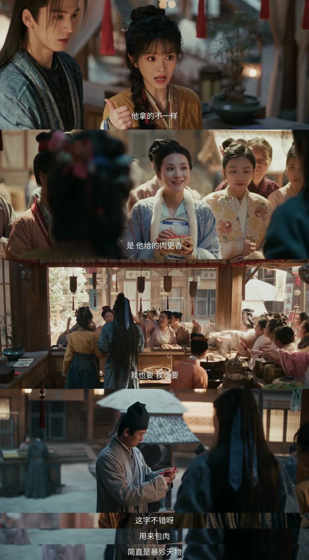 其中比较有代表性的,是男女主卖卤肉时,男主谢征(张凌赫 饰)因长相俊美,包的肉受到了女顾客的追捧,而女主樊长玉(田曦薇 饰)则遭到了女顾客的嫌弃。后面男顾客出场后,又表示女主的卤肉配不上男主写在包装上的题字。