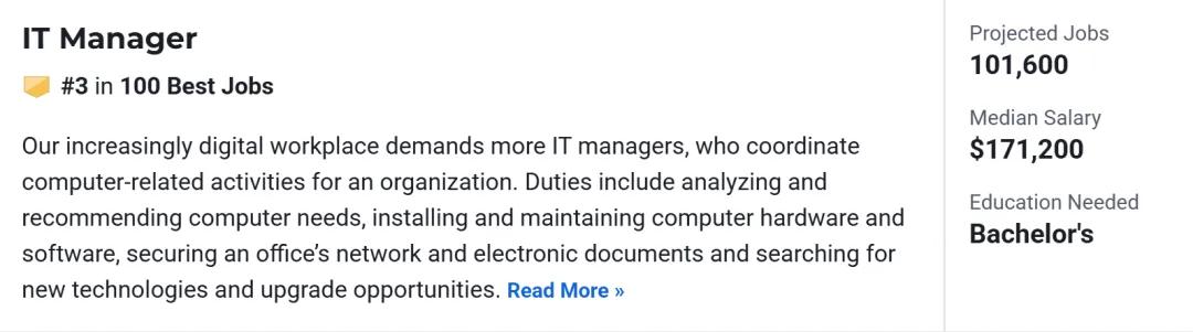 岗位职责:负责组织内部计算机相关活动,包括分析和推荐技术需求、安装维护硬件软件、保障网络安全以及寻找新技术升级方案。 预计岗位数量:101,600 中位薪资:$171,200