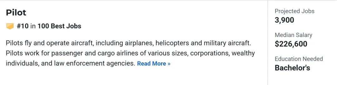 岗位职责:驾驶和操作各类飞机,包括民航、直升机及军用飞机,服务对象包括航空公司、企业、私人及执法机构。 预计岗位数量:3,900 中位薪资:$226,600