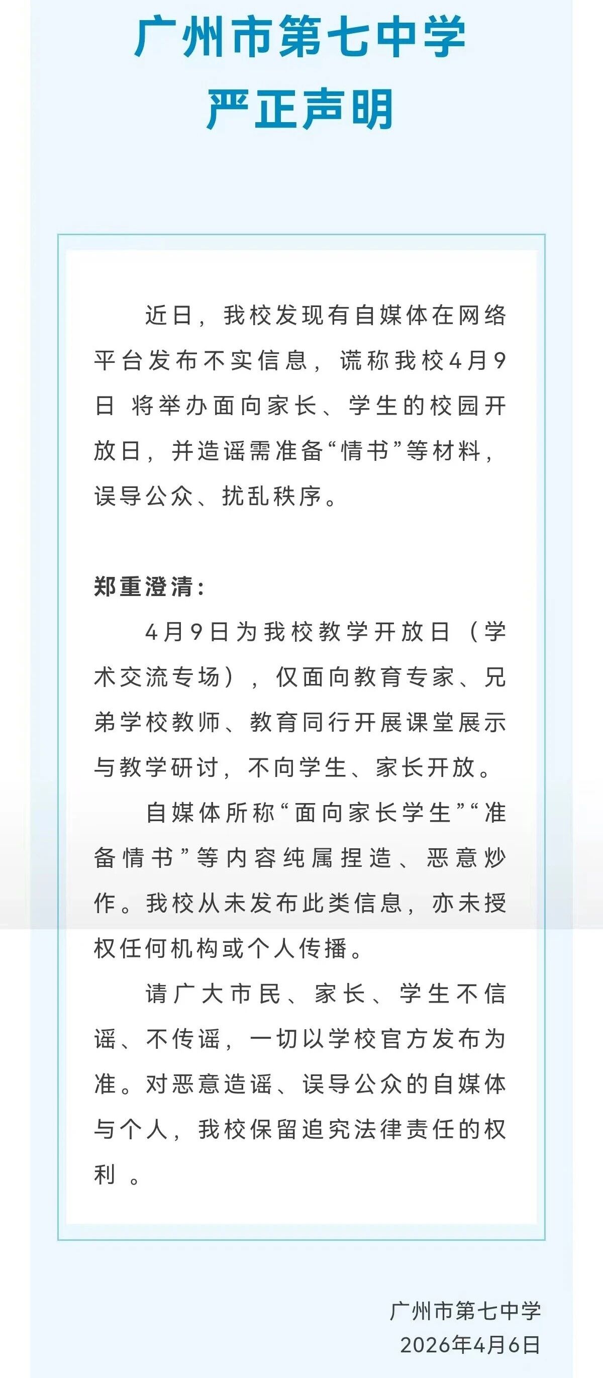 4月6日,广州市第七中学在其官方平台发布了一则严正声明,对近期网络上的不实信息予以澄清。
