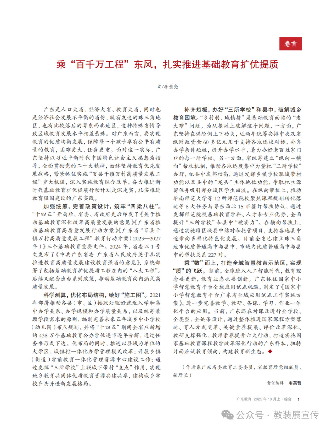 近日,广东省教育厅副厅长李璧亮在《广东教育》中提出,广东基础教育正乘“百县千镇万村高质量发展工程”东风,扎实推进基础教育扩优提质,努力“保障每一个孩子享有公平有质量的教育”。