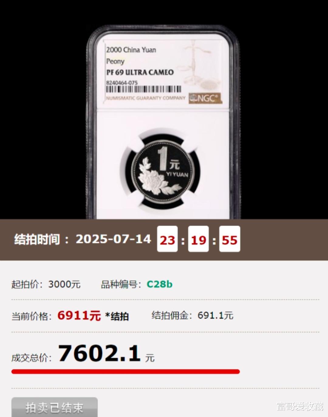 上面这枚2000年牡丹1元,在7月份的钱币拍卖会中,就拍出了7600多。