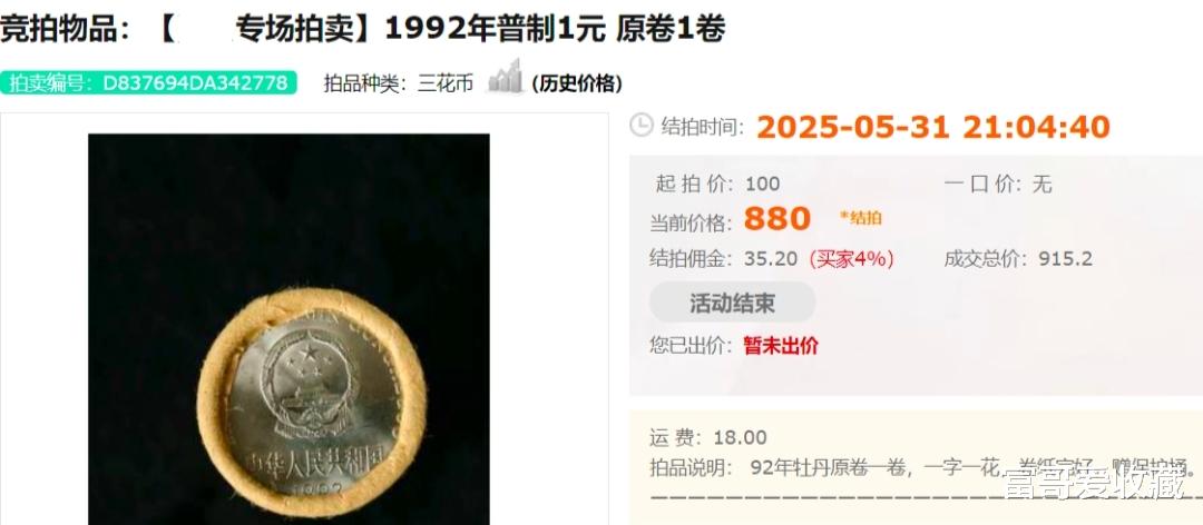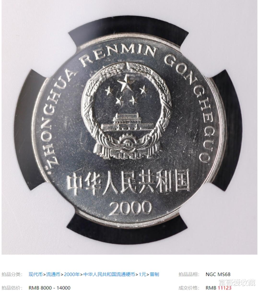 而上面这枚2000年牡丹1元,就是普制币系列,最后竟然拍出了1.1123万。