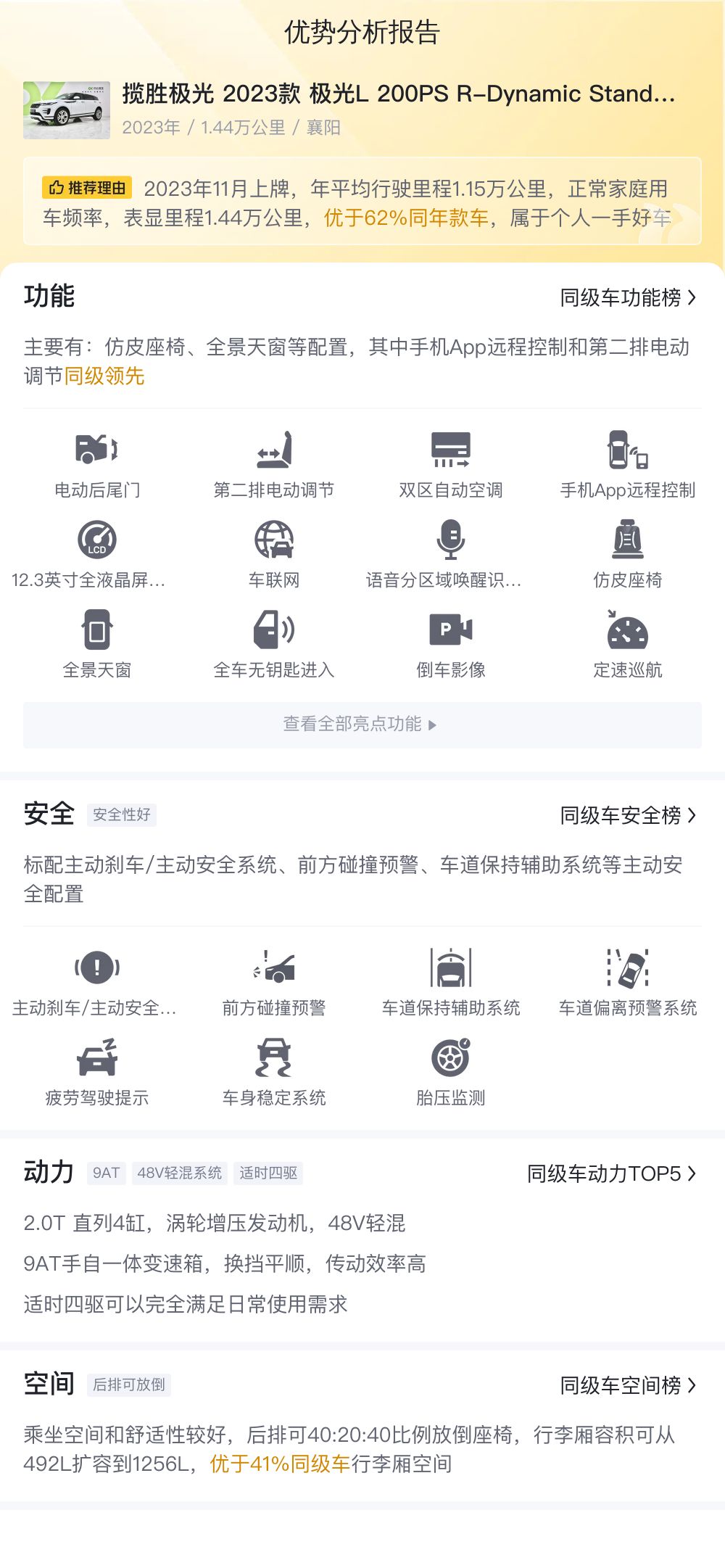 综上所述的新车含税价、用车成本、市场行情、优势分析、同款比价等数据仅供参考。在配置部分,因为二手车非标品,车辆可能会存在配置改装的情况,具体车况信息需要线下结合车辆实际情况进行综合参考。