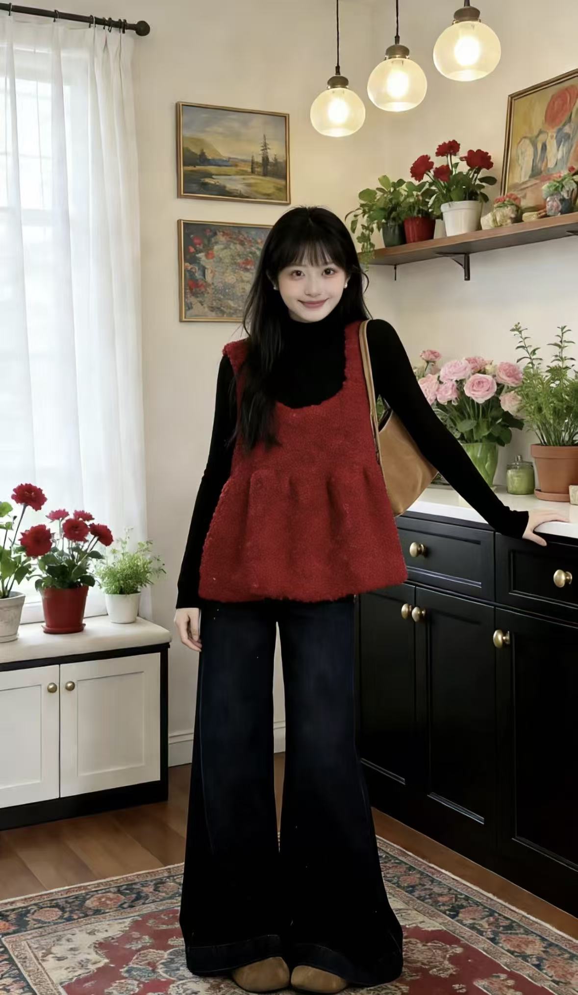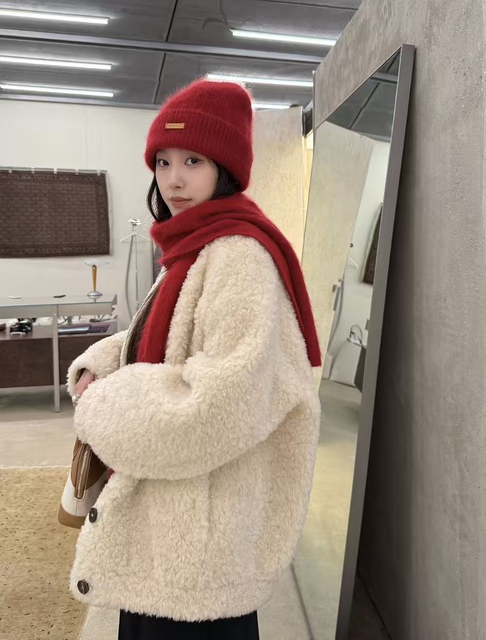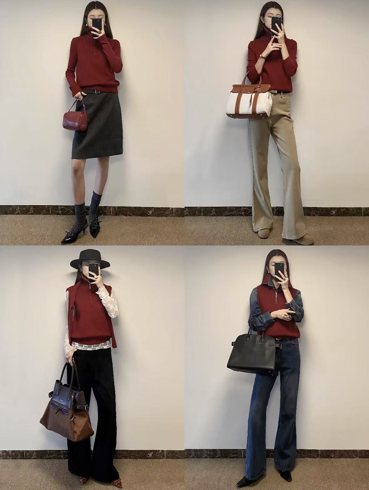 用外套隔开:穿一件红色内搭(比如毛衣),外面罩上大衣或外套,只露出领口或袖口的一点红,既有层次感,又能缓冲红色对脸部的直接影响。