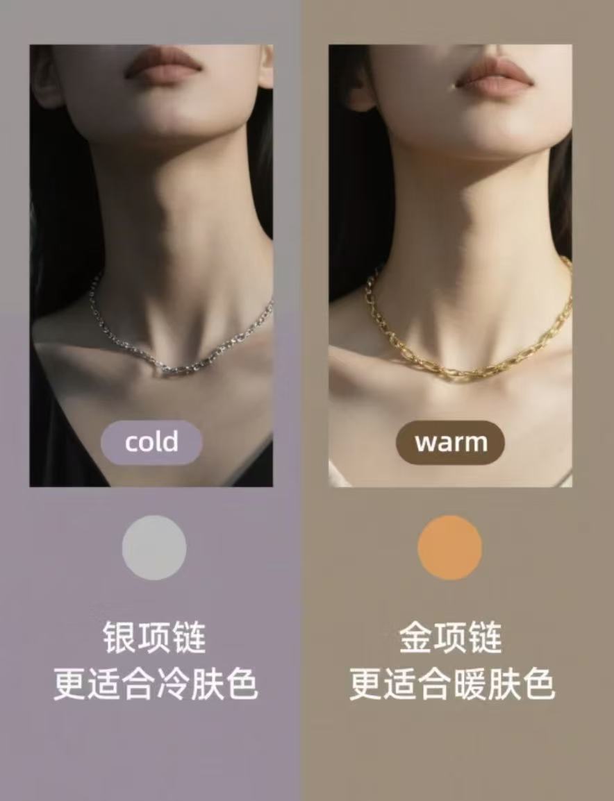 别看网上把肤色分得那么细(什么春夏秋冬型),咱们普通人抓重点就行。最简单的一招:看你适合金色还是银色。