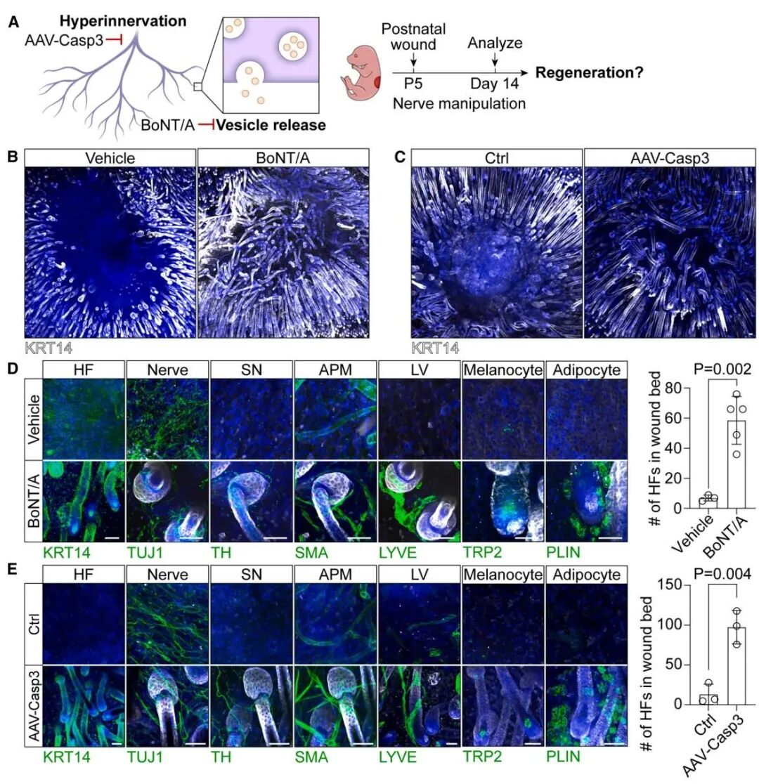 研究团队开展了激动人心的“逆转”实验。首先,他们利用基因敲除技术,清除了小鼠伤口成纤维细胞中负责分泌CXCL12的基因。结果,伤口处的局部神经不再像发了疯一样聚集。在没有了神经密集干扰的环境下,出生后小鼠的伤口竟然成功长出了毛囊、皮下脂肪、立毛肌等完整的组织结构。这无可辩驳地证明,组织器官再生的能力并没有在出生后消失,它只是被封印了。
