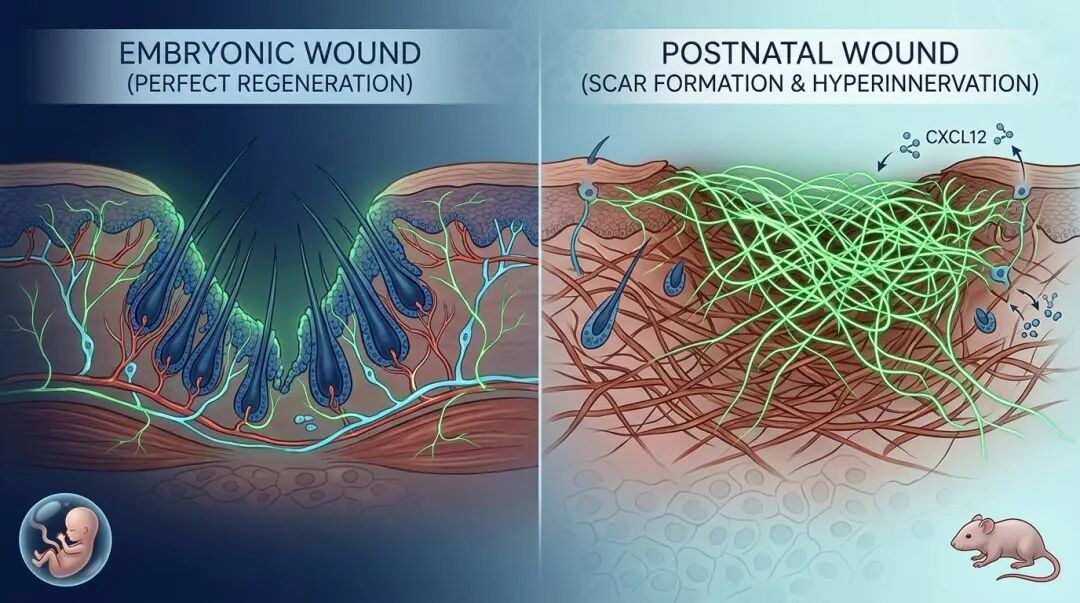 通过进一步的基因分析,研究团队发现这些PWFs细胞极其活跃,会分泌大量的可溶性因子。经过体内筛选实验,一种名为CXCL12的蛋白质浮出水面。过去的医学常识往往认为,伤口发炎、免疫细胞过度聚集是导致留疤和阻碍组织重生的主要原因。但这项研究却得出了一个颠覆常识的结论:虽然出生后的伤口确实聚集了更多的免疫细胞,但这并非阻挡细胞跨谱系再生的核心原因。真正按下了“停止键”的,其实是疯狂生长的神经。