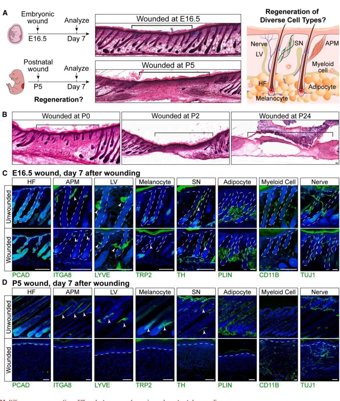 为了解开这个谜团,科学家们将目光投向了小鼠的皮肤。皮肤是我们身体最大的器官,也是结构极其复杂的组合体,它不仅有表皮,还包含了毛囊、皮脂腺、神经、血管和脂肪等横跨多个谱系的细胞。如果能弄清楚皮肤如何完美再生,就相当于掌握了复杂器官再生的核心密码。