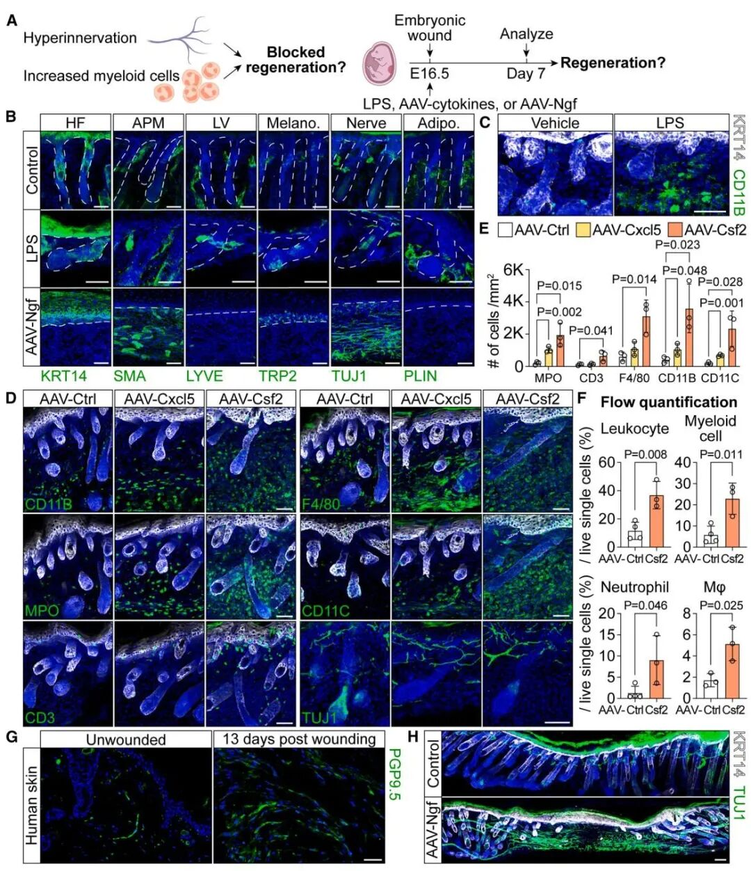 但是,对于出生仅5天的小鼠,情况却急转直下。虽然伤口的表皮依然能完成封闭,但伤口内部却进入了典型的“疤痕修复”模式:胶原蛋白杂乱地堆积,绝大多数的毛囊和附属器官都彻底罢工、无法重新生长。同样从图[1]下半部分的荧光染色结果中可以直观地发现,出生后受伤的皮肤中不仅充斥着大量的免疫细胞,而且代表神经的荧光信号极其密集,这意味着伤口区域的神经纤维呈现出爆炸式的疯狂生长(即“神经超分布”或过度神经支配)。