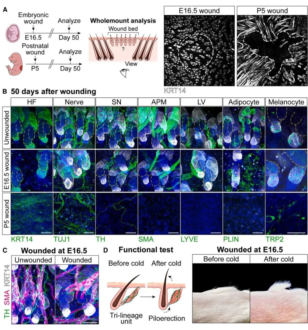 奇迹在胚胎期的小鼠身上上演了。如图[1]的显微组织切片对比所示,胚胎期受损的皮肤在7天后不仅完全愈合,还能在伤口处清晰地观察到重新长出的毛囊、立毛肌、淋巴管、黑素细胞以及皮下脂肪等各种复杂的细胞类型。更令人惊叹的是,这些重生的细胞不仅在外观上恢复了原貌,还恢复了准确的相互连接。从图[2]展示的伤口愈合50天后的全景三维显微成像中我们可以看到,绿色的神经纤维重新准确地包裹住了立毛肌和毛囊;并且研究人员通过功能测试证实,这片再生的区域能够对寒冷刺激做出灵敏的反应,引发正常的“起鸡皮疙瘩”现象。这说明,胚胎期的皮肤在功能上也实现了完美的器官级再生。