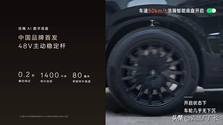 极氪9X首发搭载浩瀚AI数字底盘,不仅全系标配闭式双腔空气悬架和双阀CCD电磁减振器,兼顾更快升降、更高离地间隙与更稳操控,还采用少数顶奢旗舰才会装备、中国品牌首发搭载的48伏主动稳定杆技术,在0.2秒内完成最高80毫米的举升,有效抑制车身晃动与侧倾,动态表现接近“零侧倾”。