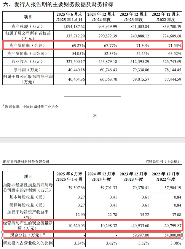 从财务表现来看,振石股份在2022至2024年间累计实现净利润超过21亿元,但经营性现金流在此期间波动显著,且多数时间为负值。与此同时,公司在2022年和2023年连续实施大额分红,总额达到11.4亿元。尽管有高额分红,公司资产负债率始终处于较高水平,2022年至2025年上半年合并报表下的资产负债率分别为71.53%、71.30%、67.77%及69.27%。公司融资结构高度依赖银行借款,截至2025年6月末,短期与长期借款合计为46.76亿元,其中有6.05亿元长期借款将在年内到期,显示出较大的偿债压力。在这一背景下,振石股份仍推进规模近40亿元的IPO募资,其“大额分红同时大额募资”的发展路径引发市场关注。