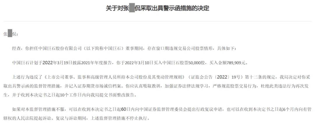 实控人张某侃因在另一家上市公司中国巨石担任董事期间的行为,收到了证券监管机构的警示函。2022年3月18日,中国证监会浙江监管局对其出具了《关于对张健侃采取出具警示函措施的决定》,指出其在窗口期内违规交易公司股票。具体而言,中国巨石计划于2022年3月19日披露2021年年度报告,而张某侃却在2022年3月10日买入该公司股票5万股,涉及金额78.99万元。这一行为因违反《上市公司董事、监事和高级管理人员所持本公司股份及其变动管理规则》(证监会公告〔2022〕19号)第十二条的规定,被监管部门采取警示函行政监管措施,并记入证券期货市场诚信档案。尽管该处罚未涉及罚款,但对公司高层个人的诚信记录及公司治理形象造成了一定影响。