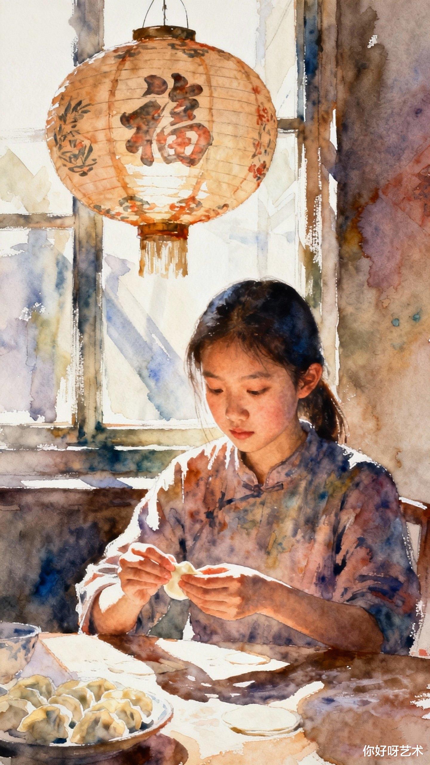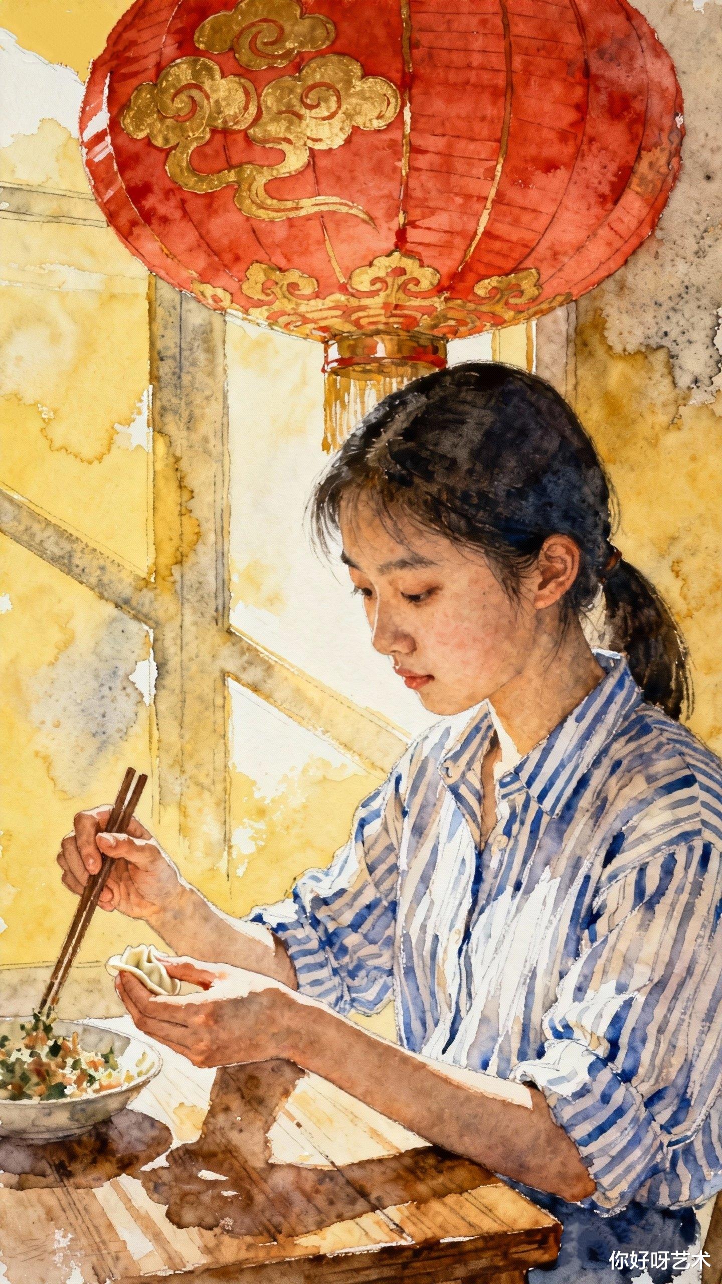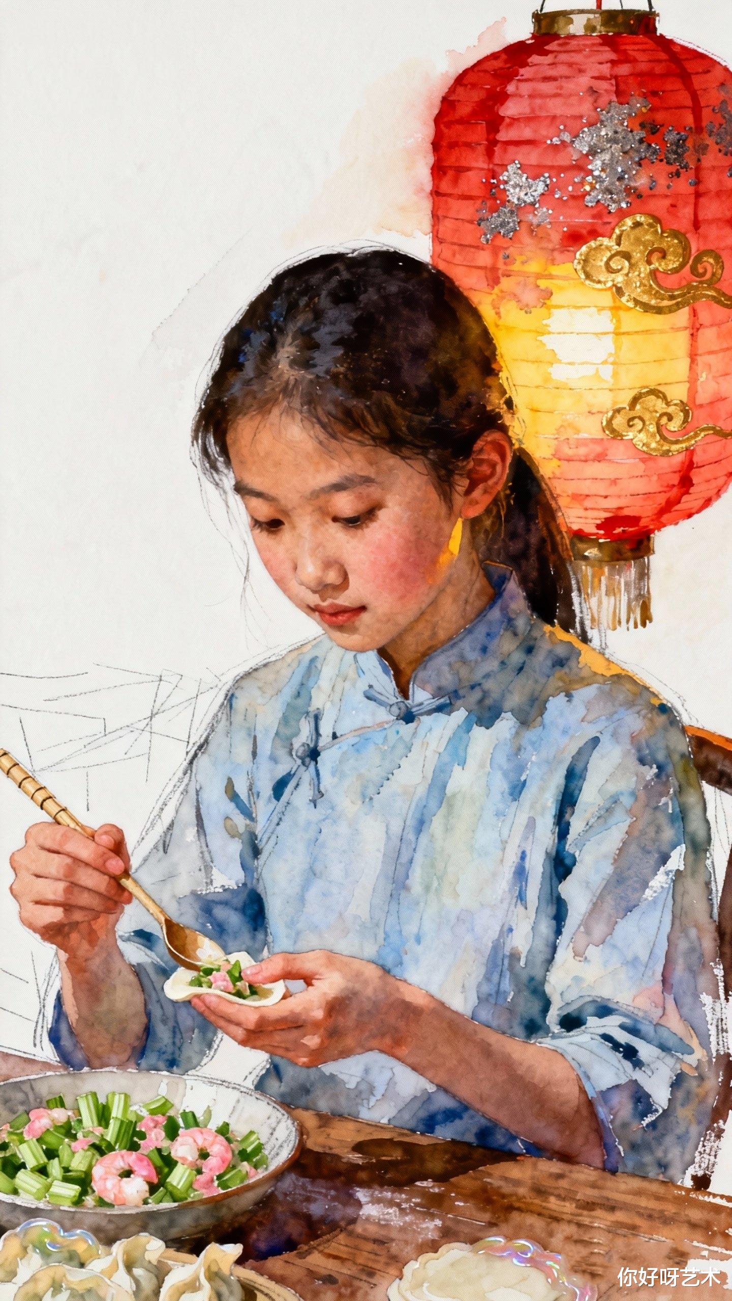 水彩在宣纸上晕开时,我总想起奶奶调馅的手。那双布满老年斑的手,将冬日的阳光揉进面团,把整个菜园的鲜香剁成细末。此刻画中的少女正用筷子夹起月牙形的饺子,蒸汽氤氲了她的眉眼,像笼着薄雾的池塘。