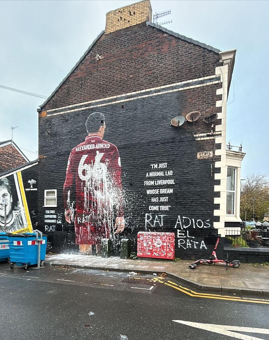 赛前,安菲尔德附近那座纪念2019年欧冠夺冠的三层楼高壁画,被人泼上白漆,旁边用英西双语写着“老鼠”与“再见”,直白的嘲讽道尽了球迷的愤怒与失望。而阿诺德抵达利物浦后在社媒晒照配文“回家了”,更被视作对旧主的二次伤害——在红军球迷看来,他早已不配称这里为“家”。