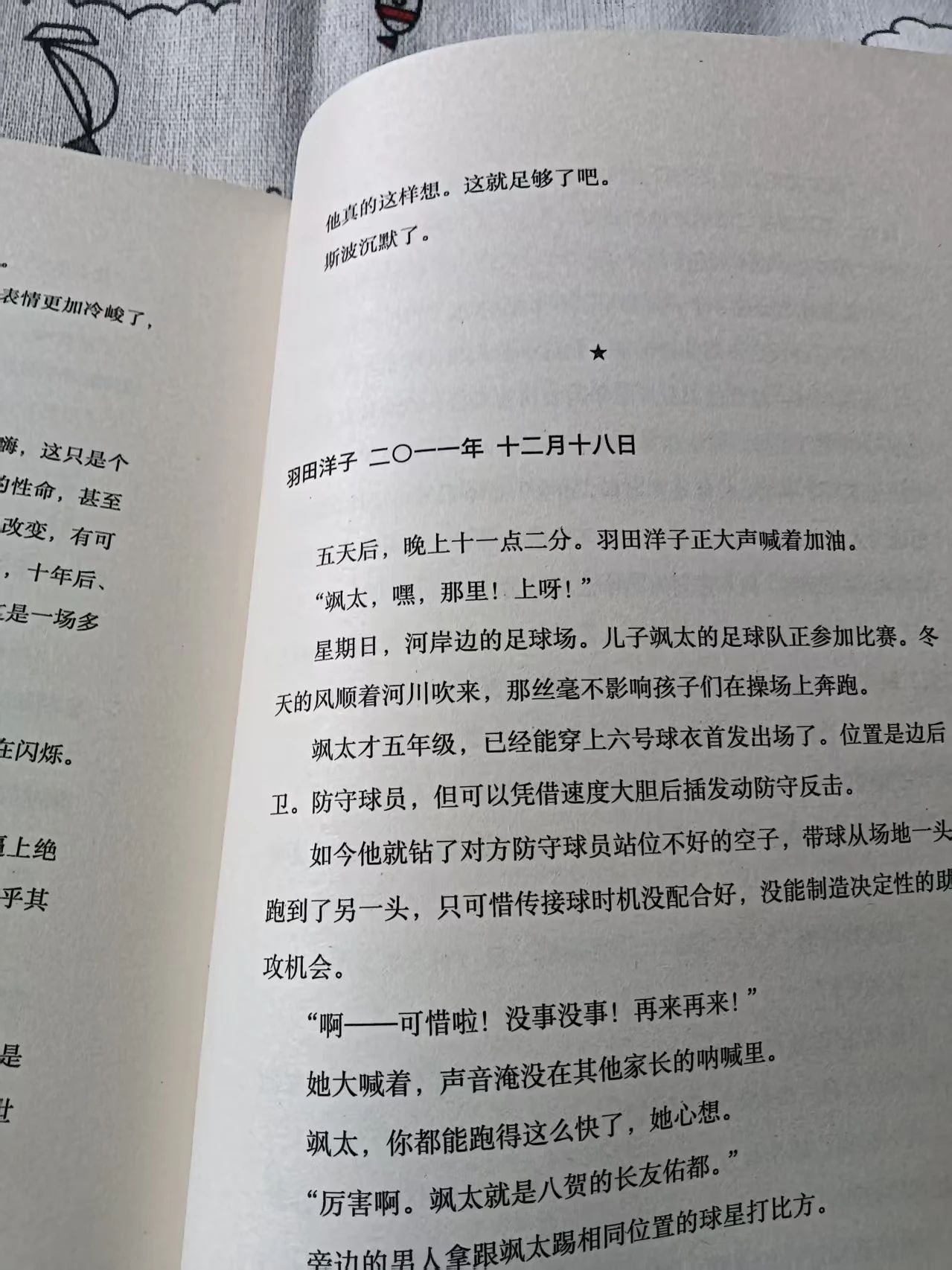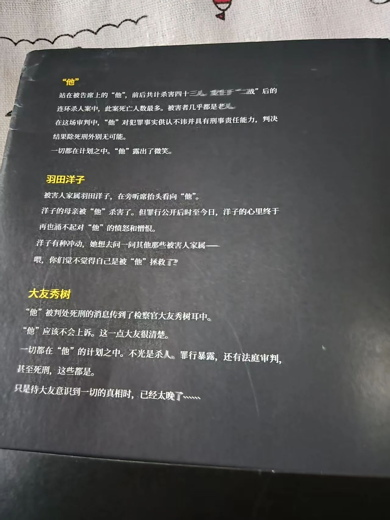 这部长篇小说是以多个视角进行叙述,在真相大白之前,也有过对凶手的描述,他来自单亲家庭,与父亲相依为命,后来父亲瘫痪了,他一直尽心尽力地照顾父亲。