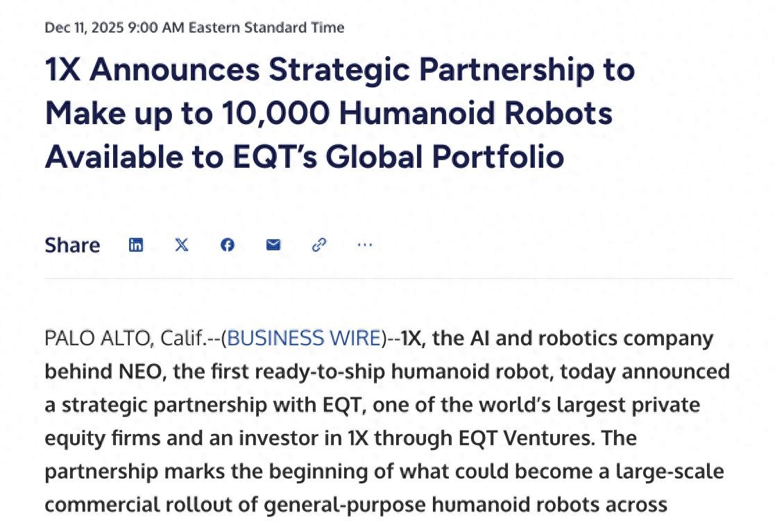 2023年12月12号,这个日子得记住,人形机器人计划公开了,2026年到2030年,都要开始部署了,欧洲的EQT,很大一家公司啊,要和1X合作,1X是做机器人的,EQT要让它投资的公司,都用1X的机器人,要一万台,很多很多,EQT很有钱的,全球第二大,这下机器人要火了,肯定会很快。