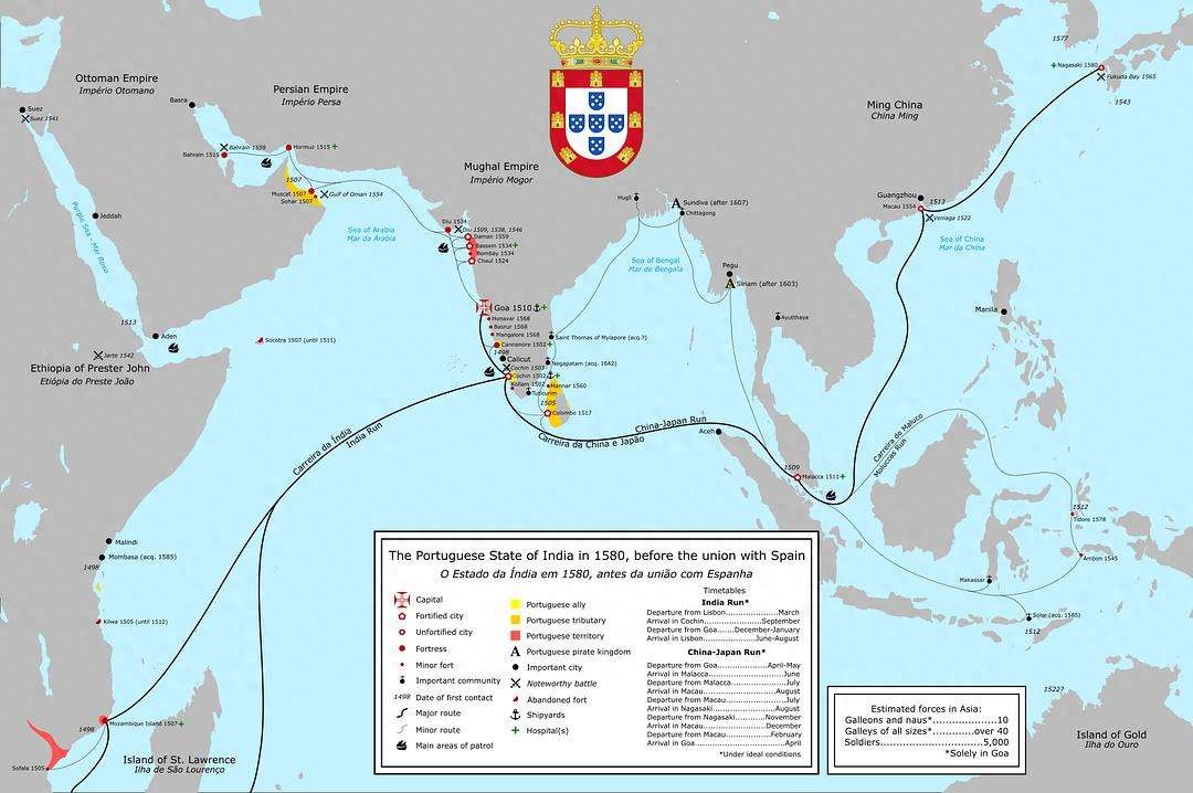 1494年6月7日葡萄牙与西班牙签订《托尔德西里亚斯条约》像切西瓜一样把地球一分为二:西经46°37'以东新发现的土地默认为归葡萄牙,而位于此线以西的土地则默认为归西班牙。1500年葡萄牙卡布拉尔舰队又发现了巴西。此时葡萄牙海军已先后击败阿拉伯、印度、奥斯曼土耳其、威尼斯的海上力量开始逐渐垄断印度洋商路。海外殖民掠夺使疆域狭小、人口有限的葡萄牙积攒了大量财富并跻身强国之列。彼时的欧洲人形容当时的葡萄牙国王曼努埃尔一世“他的宫殿是欧洲最华丽的,他的宴会是欧洲最奢侈的,他的大使是欧洲最阔气的.......”