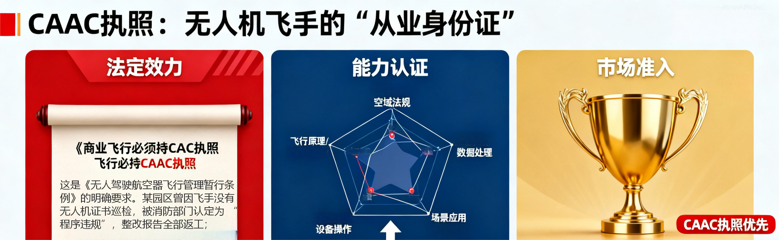法定效力独占:商业飞行必须持 CAAC 执照,这是《无人驾驶航空器飞行管理暂行条例》的明确要求。某园区曾因飞手没有无人机证书巡检,被消防部门认定为 “程序违规”,整改报告全部返工;