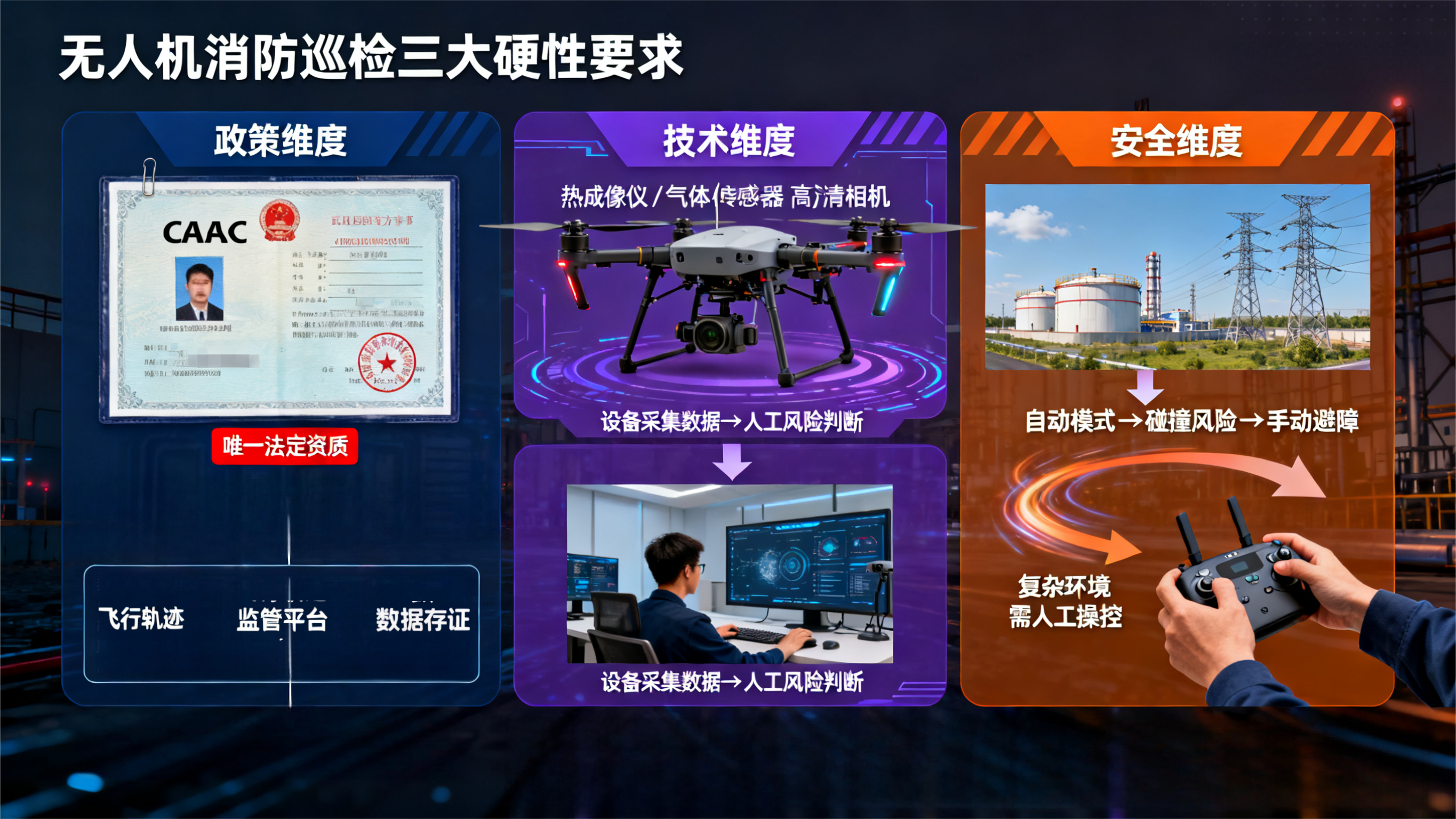 政策层面:新规要求园区消防巡检数据 “可追溯、可验证”,这意味着飞手必须持 CAAC 执照(唯一法定资质),飞行轨迹要接入官方监管平台 —— 无人机无法自主完成资质认证和空域报备,这些都需要人工主导;