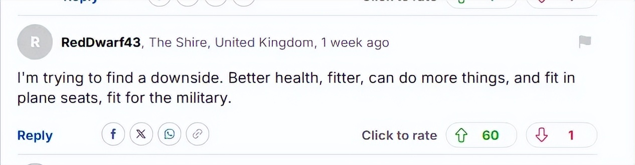 “我在努力找它的缺点。身体更健康、更强壮,能做更多事情,坐得进飞机座位,也符合参军标准。”