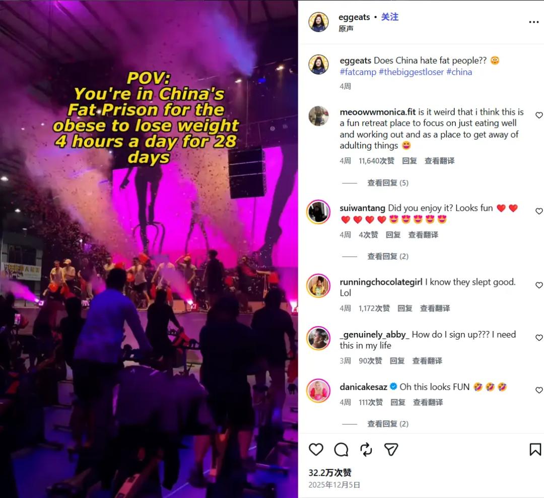 事情是这样的:一个名为“eggeats”的澳大利亚华裔女孩,来中国参加了四周的减肥营——并且把这个过程全程记录在了自己的INS上。