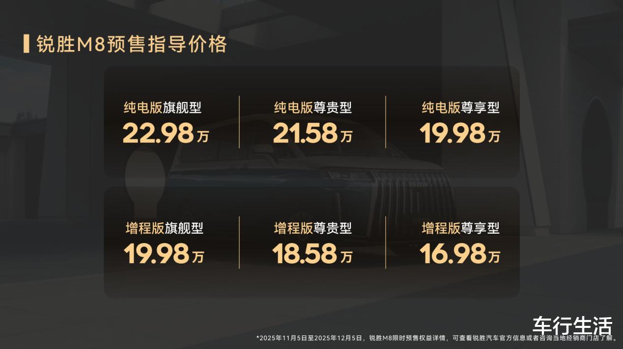 锐胜M8提供增程版和EV版两种动力选择,预售价格分别为16.98万元起和19.98万元起。这一价格区间的设定,打破了传统大型MPV普遍高于20万元的价格壁垒。而且为回馈首批用户,锐胜汽车推出了诚意十足的八重礼遇,预售期间下订用户可尊享价值至高2.98万元的八项专属好礼。这一举措不仅降低了消费者的购车门槛,也展现了企业对产品市场表现的信心。