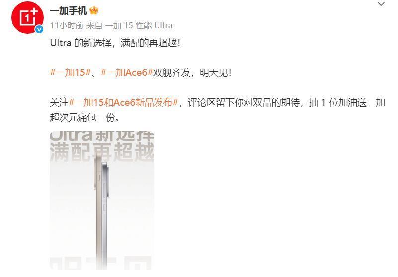 日前,@一加手机 正式官宣了新机预热海报,并配文称,“Ultra 的新选择,满配的再超越!#一加15#、#一加Ace6#双舰齐发,明天(10月17日)见!”同时,@李杰Louis 也表示,“知道大家等这一刻很久了,我们也一样。当Ultra被重新定义,满配也迎来新的进化。终于要和大家见面了。#一加15# #一加Ace6# 双舰齐发,明天(10月17日)见。#一加15和Ace6新品发布# ”。
