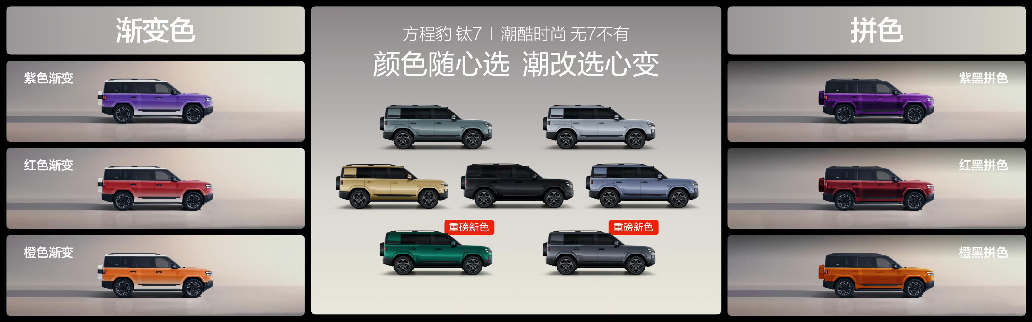 为了让广大用户选得尽兴,钛7直接一步到位,带来了7款外观颜色、3款内饰颜色,同步在官方商城上架了6款潮改方案,可满足不同用户的审美偏好。在购车权益上,方程豹更是诚意十足,为首批车主带来了总价值最高超3.6万元的7大钛享好礼!其中包括:覆盖多项座椅舒适配置的总价值10000元舒享升级包、价值3599元的BYD Pad套装、价值4500元的新车交付礼包均免费送;提供3年0息、5年低息、0首付起或至高84期等多重金融方案以供选择,金融贴息最高价值11300元;还有最高价值6000元的置换补贴、价值900元的智慧生态礼包,以及2年5G每个月的免费车机流量、非营运车辆长达6年或15万公里的整车包修、“三电”系统的终身保修、终身免费系统OTA升级等,让每一个家庭都能轻松拥抱钛7,让美好生活触手可及。