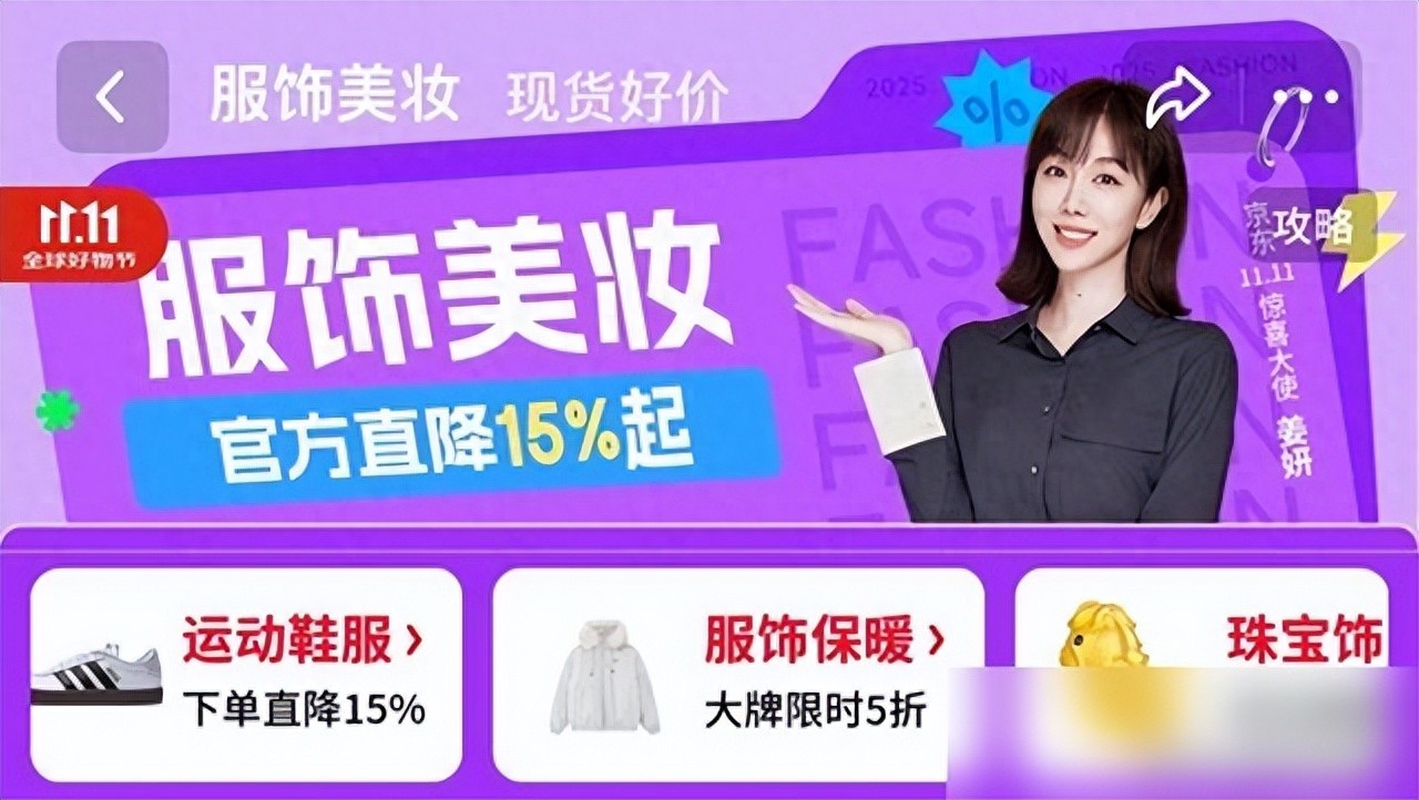 其实最戳我的是“简单直接”——不用算满减算预售,直接官方直降15%起,冲锋衣85折,美妆领券减2200,点开京东APP搜“服饰美妆1111”就能直达会场。不像去年双11,我算满减算到凌晨三点,最后还因为“预售没凑够”退了三件。