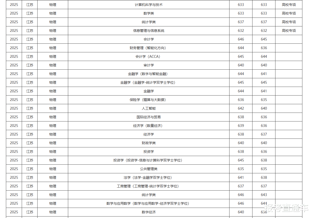 物理类的表现同样亮眼,甚至在部分专业上更显“卷王气质”。最高分由统计学类、数学与应用数学(数学与应用数学—经济学双学士学位)、会计学共同领跑,录取分均为646分。传统财经优势叠加数学强基,吸引力自然爆发。尤其是数学+经济学双学位,更是深受冲刺顶尖金融、量化、咨询方向的学生青睐。