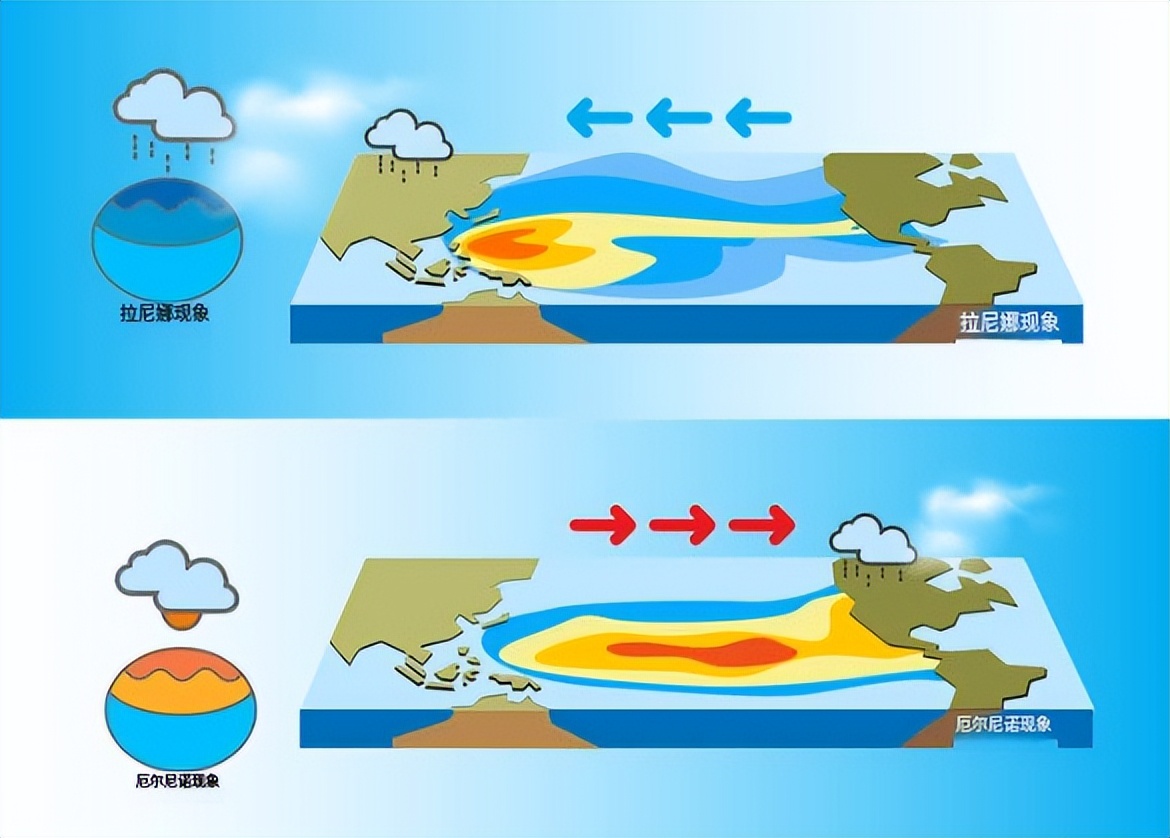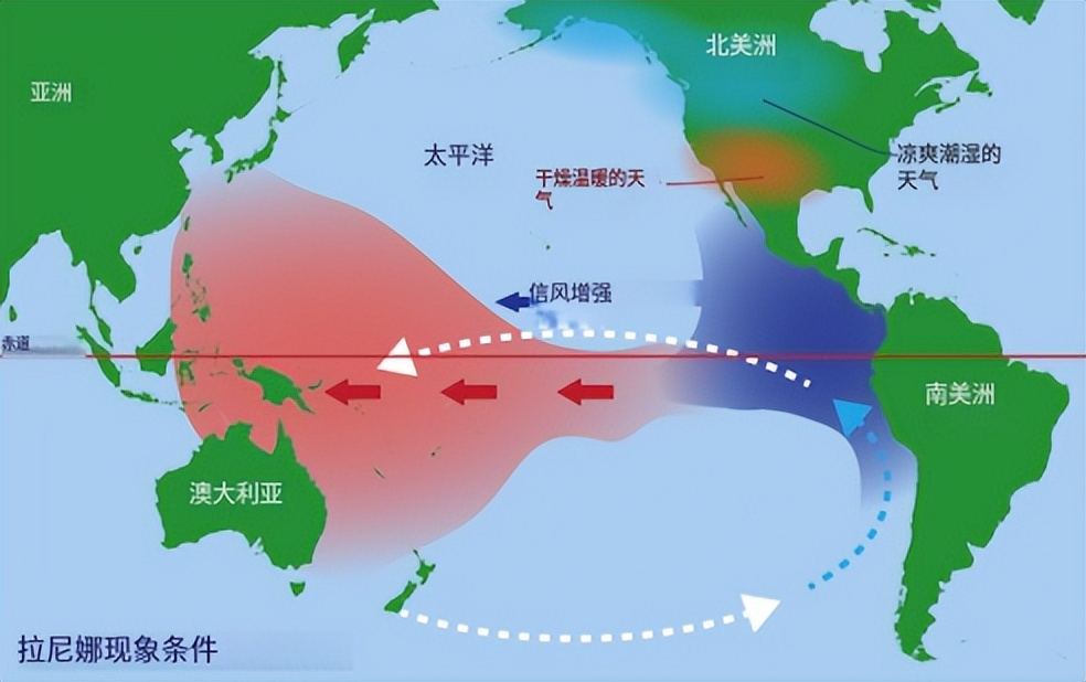 正常年份,信风带把太平洋上层温暖的海水吹向西侧大陆,在蒸发作用下,这些温暖的海水变成了水蒸汽进入空中,再变成云。在空中携带着温和的能量,积蓄到一定程度再变成雨、雪落回地面。