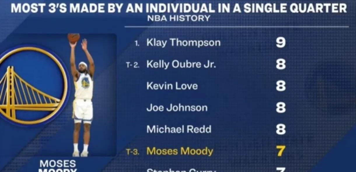 穆迪从第一节,投进第一个3分开始,之后就再也没有停过,第2记,第3记,一直来到第7记,单节扔进7个3分球,拿到21分,全场打进8个3分球,拿到32分,而他也成为NBA历史上单节命中3分球第6多的球员,比他们的,只有凯文乐福,利拉德,克莱汤普森,库里也只有7个。如果勇士的角色球员,也能站出来的话,勇士这个赛季还保留一点希望,否则,真的不知道这只老年队,能不能坚持到82场比赛结束。