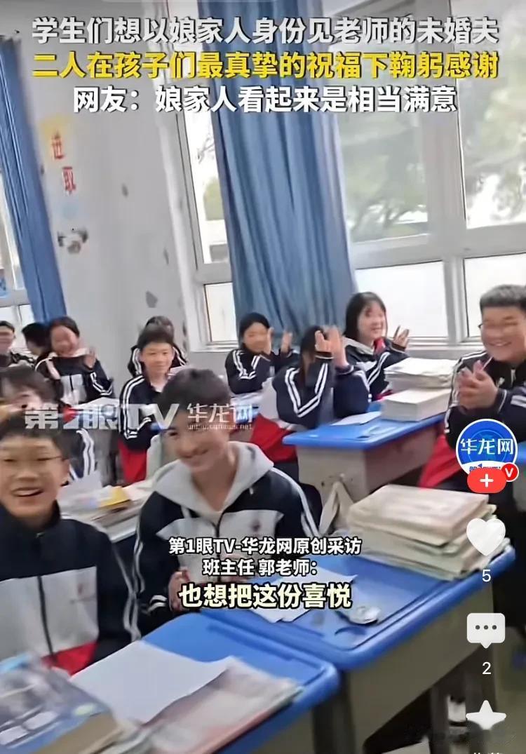 “娘家人看起来是相当满意!”这段充满爱的互动被分享到网上后,网友们纷纷留言点赞。有网友感慨:“这才是最纯粹的师生情,孩子们的祝福太治愈了!”也有网友表示:“老师把幸福分享给学生,这样的教育太温暖了,给孩子们的童年留下了美好的回忆。”