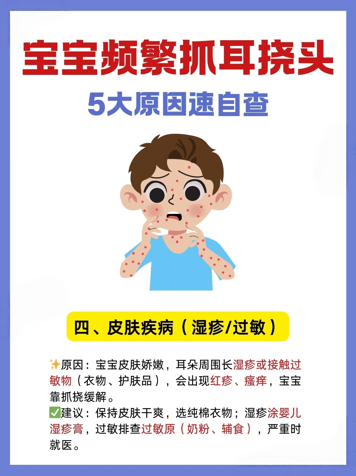 还有些宝宝是过敏体质,换了新奶粉、新衣服、新护肤品,皮肤出现反应,也会表现为耳朵周围的瘙痒。