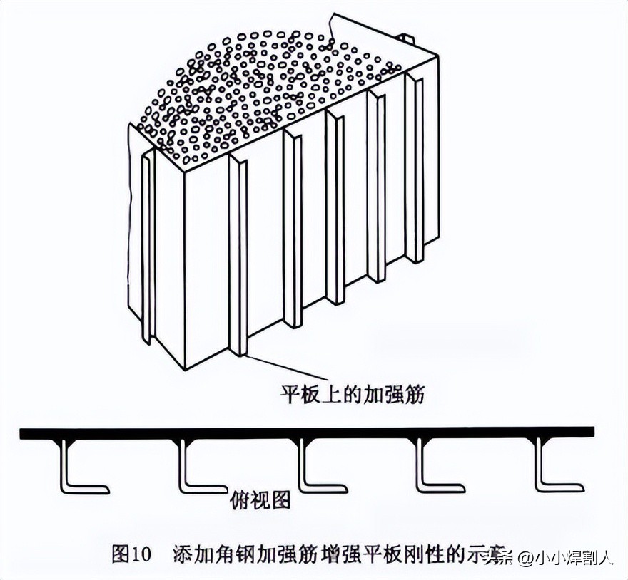 增强平板的刚性以承载负荷的标准方法是在平板上垂直焊接一系列的角钢,添加角钢加强筋以增强平板刚性,如图10所示。