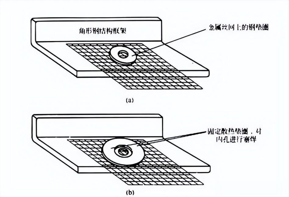 ① 在金属丝网或延伸金属上放置非金属垫圈并且将垫圈、金属丝网和框架夹紧在一起,不允许采用含铬或镀锌垫圈,垫圈应采用未涂敷的,见图3(a)。