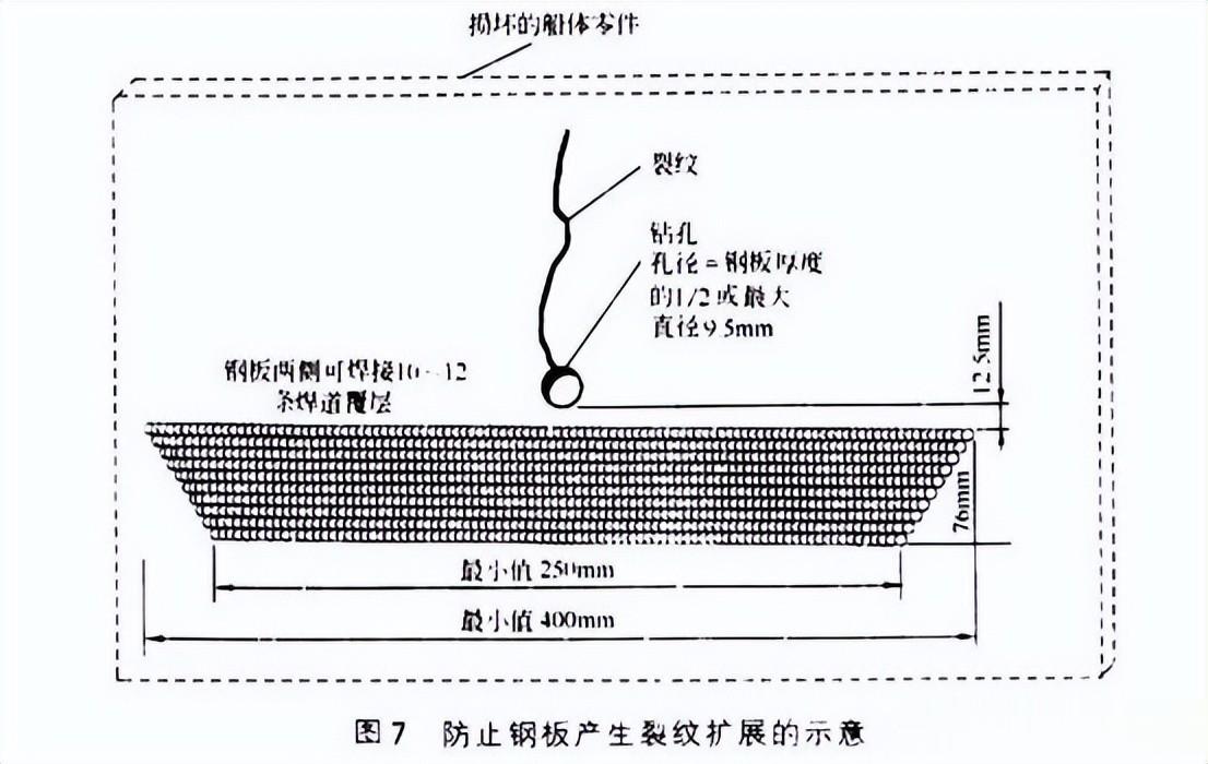 首先在裂纹末端钻一个小孔,以利于在较大的范围内分散末端的应力,然后焊接一系列长度不等的多道焊缝,增加裂纹前端钢板的强度。防止钢板产生裂纹扩展的示意见图7。