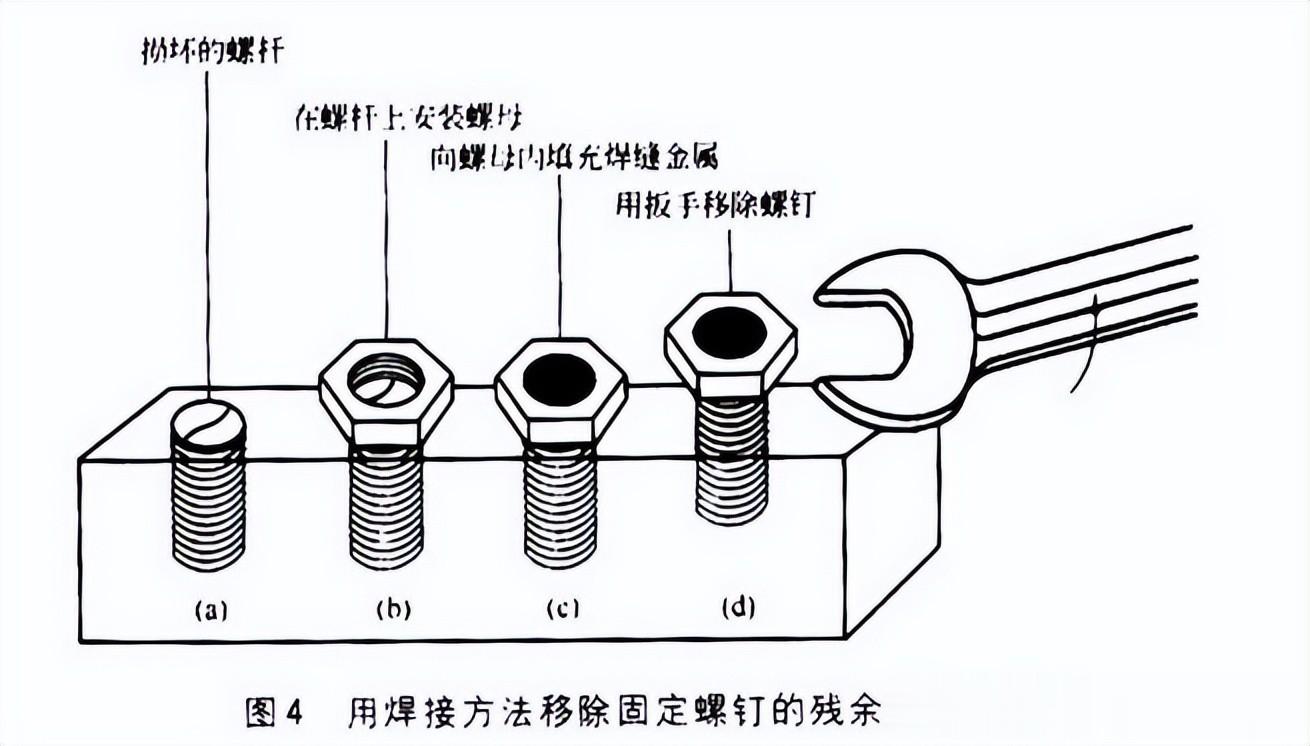 ② 如果螺钉槽、螺母或牙槽损坏或丢失,可以在螺钉头的上部(或残余部分)放置一个螺母,旋紧螺母,然后采用任何焊接方法在螺母和螺钉的内部填充金属。这样就会将螺母和螺钉残余部分连接起来,然后在螺母上放置扳手或牙钳,迅速拔出螺钉。采用这种方法有利于提供一个新的握力点并可利用热量使螺钉紧固,用焊接方法移除固定螺钉的残余部分示意如图4所示。