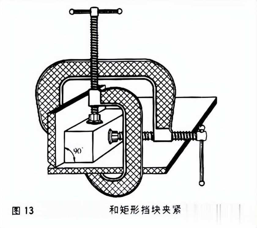 焊接时用一个钢制挡块或者一个矩形物体作为辅助工具,采用C形夹具和矩形挡块夹紧角焊缝,如图13所示