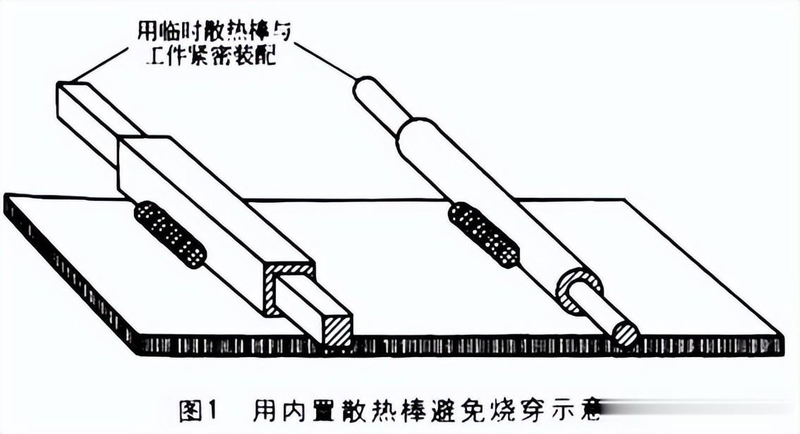 有,主要是在焊接过程中采用一个散热棒。如将一个实心圆棒插入薄壁圆管中,或将一实心矩形棒插入矩形管件中,实心棒将会带走薄壁工件的热量并防止烧穿。一般来说,在多数供货的中空管或矩形管材料中都紧密安装了实心圆棒或矩形棒。焊接时应注意将焊缝远离管子的末端,管子的末端是最易发生烧穿的薄弱区域。用内置散热棒避免烧穿的示意如图1所示。