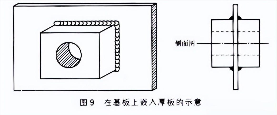 将一厚板金属嵌入基板需要加厚的部位,然后采用焊接方法进行固定。在基板上嵌入厚板的示意见图9。这样可以给后续的机械加工、镗削加工或钻孔提供足够的厚度,并可以代替设备中的大厚度零件或铸造件。