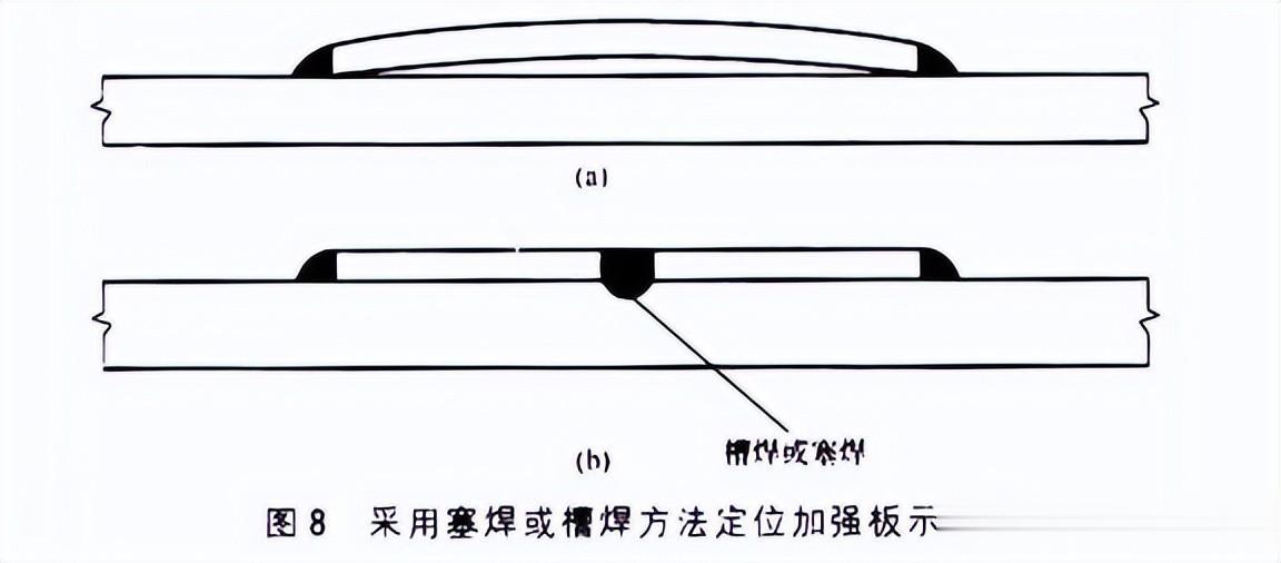解决的方法是在加强板中间部位采用塞焊或槽焊,将加强板表面与基板表面贴紧,消除变形以利于进行机械加工。采用塞焊或槽焊方法定位加强板示意如图8(b)所示。