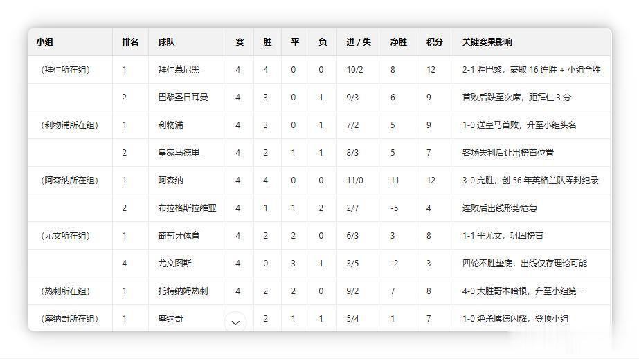 北京时间昨夜今晨,欧洲第4轮先赛9场。皇马、巴黎首败,拜仁阿森纳齐揽4连胜,冷门与纪录剧情拉满欧冠热度,欧冠小组排名又有新变化。