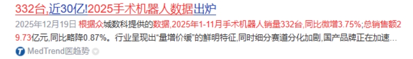 难度外科手术医生真的要被机器人替代?有可能是真的!目前在商业化方面,根据众成数科数据,2025年1-11月手术机器人销量332台,同比微增3.75%,总销售额29.73亿元,同比小幅下滑0.87%。