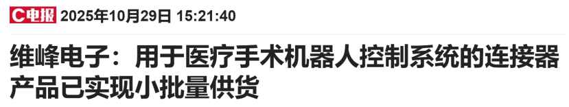 手术机器人卡位:公司在医疗手术机器人控制系统的连接器产品,已实现小批量供货。