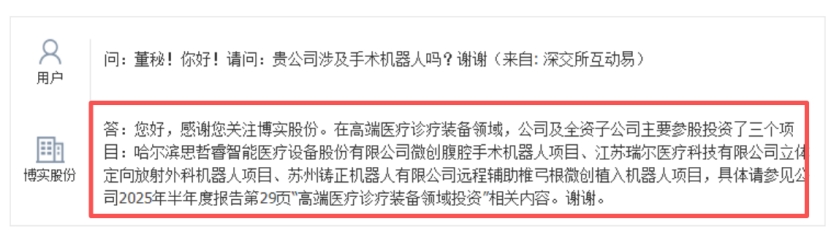 手术机器人卡位:公司及全资子公司主要参股投资了三个项目:哈尔滨思哲睿智能医疗设备股份有限公司微创腹腔手术机器人项目(对应达芬奇)、江苏瑞尔医疗科技有限公司立体定向放射外科机器人项目、苏州铸正机器人有限公司远程辅助椎弓根微创植入机器人项目.