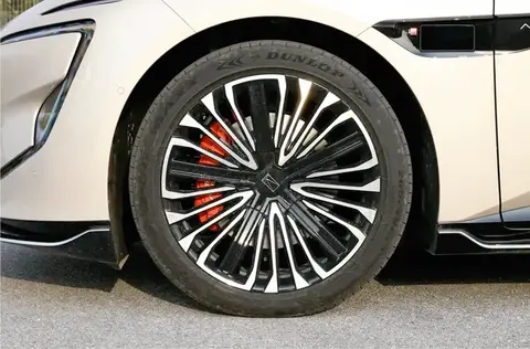 侧面来看,无边框车门和隐藏式门把手成为标配,轻按车门自动弹开,上车颇具仪式感。19英寸低风阻轮毂搭配选装的红色四活塞卡钳,运动气息浓郁。车顶线条流畅,全新升级的四激光雷达集成在车顶和翼子板两侧,仿佛“未来战士”的传感器,科技感十足。