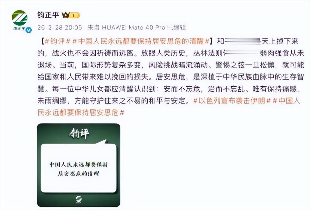 2月28日,钧正平工作室强调要永远保持居安思危的清醒,它把国际环境说得很直白,丛林法则依然盛行,弱肉强食从未退场,并提醒国民安而不忘危,治而不忘乱。